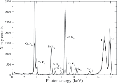 Or l’analyse spectrale montre que la partie gravée de cet objet comporte des traces de fer, zinc, plomb et cuivre en quantité plus importante que sur les parties non gravées. Ceci apparaît bien sur le graphique ci-dessous, où le trait noir correspond à une partie non gravée, tandis que le trait gris concerne une partie gravée. Il y a plus de fer, de cuivre et de zinc dans la partie gravée, qui en revanche montre moins de calcium :