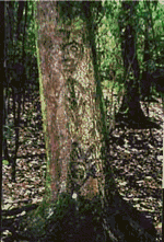 L'intérêt des dendroglyphes pour qui s'intéresse à l'esprit des pierres, c'est que parmi ces gravures sur écorce se trouvent parfois des motifs identiques aux thématiques rupestres. Le regretté Edmond Bernus avait déjà nagère attiré l'attention sur les incriptions en caractères tifinagh (servant à noter la langue des touareg) ainsi gravées sur l'écorce de certains arbres du Sahara, mais c'est vrai aussi en Nouvelle-Zélande, où certaines de ces images remontent aux environs de 1900, comme c'est le cas aux îles Chatham, ci-contre (la seconde d'après le Department of Conservation de Nouvelle-Zélande)