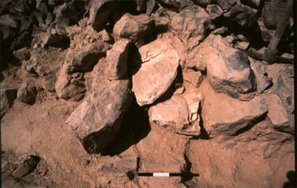 L'argument se base en partie sur la découverte, dans un tumulus non daté comme on en connaît des dizaines de milliers dans les déserts, d'une pierre blanche en forme de demi-cercle (visible au centre sur la photo ci-contre). Pour le fouilleur, qui cite la Genèse (31.43-54) à l'occasion de cette trouvaille, ce tumulus serait donc dédié à la lune, et plus précisément à un dieu lunaire, qui ne saurait être que le dieu Sin. Il en résulte que la montagne où se trouve le site est un "mont de Sin", c'est-à-dire le Sinaï, CQFD.