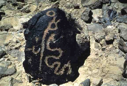 Sur un autre bloc (photo ci-contre), trouvé sur le site 32 de Har Karkom, le même auteur reconnaît un "bâton" muni de "cornes qui indiquent l'énergie ou le pouvoir", ainsi qu'un "idéogramme" (en forme de "U", à sa gauche) qui signifierait "la transformation ou le changement", alors que les points qui l'accompagnent connoteraient l'action de "faire". Comme un "serpent" se trouve à droite de cet ensemble, toute cette gravure -- nous révèle Anati -- "commémore probablement l'histoire d'un bâton de pouvoir qui se transforma en serpent".