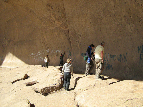 Plusieurs plaintes ont été adressées, qui sont restées sans réponse, et finalement, l'archéologue Nick Brooks, qui travaille dans cette région, a rendu l'affaire publique en mettant en ligne toute une série de photos de ces dégradations et en en parlant sur son blog. Avec lui, on ne peut que s'attrister de voir que les membres d'une organisation des Nations Unies, ladite MINURSO, saccagent impunément les mêmes sites archéologiques que d'autres membres d'une autre organisation des mêmes Nations Unies, ceux de l'UNESCO, tentent d'inventorier et de sauvegarder! Et Nick Brooks de conclure: "As long as UN staff on the ground in Western Sahara delight in defacing rock art, perhaps it is best not to advertise its location." (tant que le personnel des Nations Unies en poste au Sahara Occidental se complaira à dégrader l'art rupestre, il serait peut-être mieux de ne pas rendre publique la localisation des sites). C'est certes vrai, mais j'ajouterai que cela l'est pour l'ensemble du Sahara, et même pour l'ensemble de l'Afrique, où les dégradations et les pillages vont bon train, parfois par suite du désoeuvrement et du manque d'information, mais souvent aussi pour des raisons mercantiles. Le mieux est donc de ne signaler les sites archéologiques que par un code hermétique aux non-initiés, suffisamment précis pour travailler sur des SIG et produire des cartes de répartition (des styles, des sujets, etc.), tout en restant assez flou pour ne pas permettre de retrouver facilement les sites sur le terrain. Et à cet effet, donc, je renouvelle le conseil d'utiliser ce système d'identification.