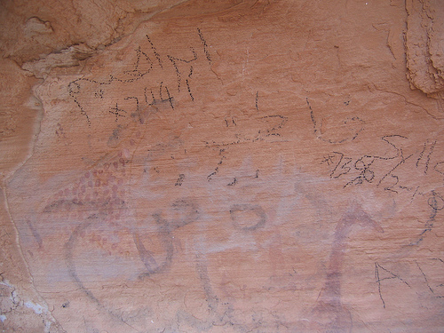 Ces girafes font partie des images rupestres préhistoriques qui sont désormais à peine visibles sous les graffiti.