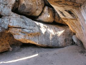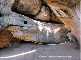 Les deux seules images rupestres de cette grotte sont une girafe et un éléphant. Evidemment, il aurait été mieux d'y trouver une peinture de python, qui aurait confirmé le tissu d'hypothèses échaffaudé par Sheila Coulson. Mais que nenni. Aussi fait-elle appel à un mythe San actuel ou sub-actuel, selon lequel un python tomba dans un trou d'eau et fut sauvé par une girafe. Quel rapport ? demanderez-vous. Eh bien, c'est très simple: l'éléphant est une métaphore du python (à cause de sa longue trompe) donc la girafe du mythe a sauvé une "métaphore de python", et ces peintures confirment l'hypothèse. C'est quand même un peu tordu. Sans compter que cela suppose la transmission d'un mythe inchangé sur 70.000 ans, ce qui serait une première.