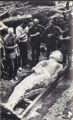 Alors, le 14 décembre suivant, un fabricant de cigares de Binghamton, répondant au nom de George Hull, avoua qu'il était bien l'auteur de cette farce, préparée de longue date. Un jour qu'il avait longtemps disputé avec un révérend méthodiste qui interprétait la Bible littéralement, il lui avait pris l'envie de se jouer des créationistes dans son genre. Il fit sculpter le géant à Chicago et le vieillit un peu à l'acide, avant de le faire envoyer à Cardiff où lui-même et Newell l'enterrèrent (pardon: l'inhumèrent) dans la ferme de ce dernier, en novembre 1868. Cela n'avait pas coûté moins que 2600 dollars, sculpture, main-d'œuvre et transport compris. Puis Newell attendit un an avant de demander à ses ouvriers de creuser un puits juste à l'endroit de la "tombe", sachant bien quelle serait leur réaction en trouvant le géant. Une fois le canular éventé, le géant n'en eut toujours pas moins de succès! Malgré la démonstration de Marsh, qui avait montré que les coups de burin étaient parfaitement visibles en maints endroits du pseudo-fossile, les gens voulaient toujours venir le voir, et il ne manquait pas de fondamentalistes toujours prêts à bondir sur les occasions de défendre une interprétation littérale de la Bible. La découverte du Géant de Cardiff prouvait que la Bible disait vrai, et les saintes Ecritures "prouvaient" que le Géant de Cardiff était bien l'un de ceux que cite la Genèse 6.4 sous le nom de Nephilim, ou bien l'un des Anaqim mentionnés par Nombres 13.33 (ces géants excitent toujours certains égyptomanes, du reste, ainsi qu'on peut le voir par le dernier livre de Patrick C. Heron). En tout cas, Barnum en proposa 60.000 dollars pour l'exposer trois mois. Devant le refus de Hull et Newell, il en fit sculpter une réplique, qu'il exposa, et davantage de gens encore vinrent contempler ce faux faux fossile. Hull et Newel voulurent intenter un procès à Barnum pour plagiat, mais ils durent renoncer à toute poursuite, car il leur fut demandé de prouver d'abord l'authenticité de leur propre géant.