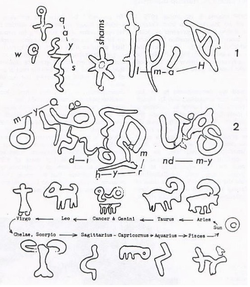 Voici maintenant la copie du même ensemble, publiée par Barry Fell, avec en haut, la transcription des "caractères koufiques" et au-dessous le "zodiaque".