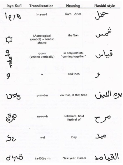 Cela se traduirait ainsi: "Quand le bélier et le soleil sont en conjonction [équinoxe de printemps] c'est le jour de célébrer la fête de la nouvelle année".