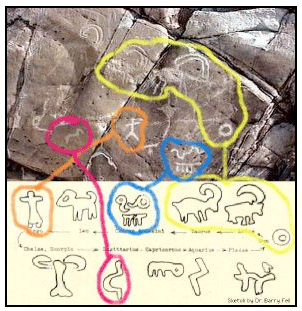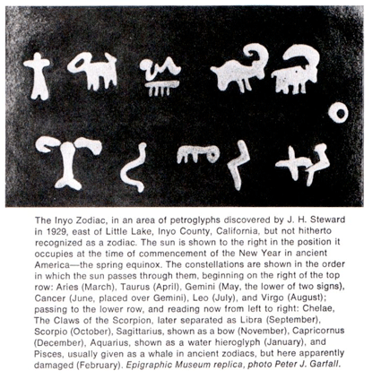 Barry Fell, professeur émérite de l'Université d'Harvard, a réutilisé ces documents pour y voir ce qu'il pense être "un ancien zodiaque", dont témoigneraient des inscriptions rupestres découvertes à Inyo (B. Fell, "An Ancient Zodiac from Inyo, California", Epigraphic Society Occasional Papers, 21: 263-267). La découverte d'un authentique zodiaque préhistorique sous forme de gravures rupestres serait déjà des plus intéressantes, mais ici, Barry Fell ajoute que ledit zodiaque serait de plus associé à une inscription sémitique en caractères koufiques !