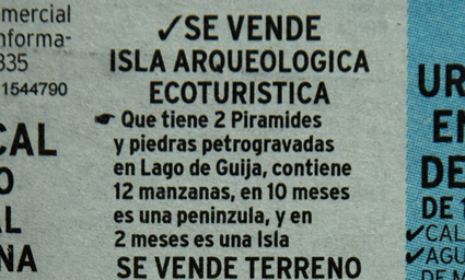 "A vendre, île archéologique et écotouristique, avec deux pyramides, des pierres gravées, dans la lagune de Guija… durant dix mois c'est une presqu'île et pendant deux autres c'est une île." (Annonce parue dans "El Diario de Hoy")