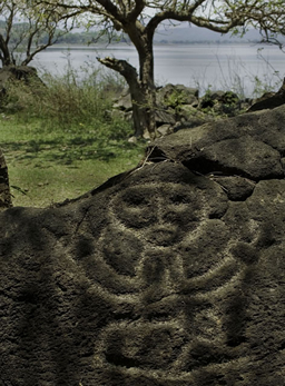 Une des gravures rupestres encore en place dans l'île.